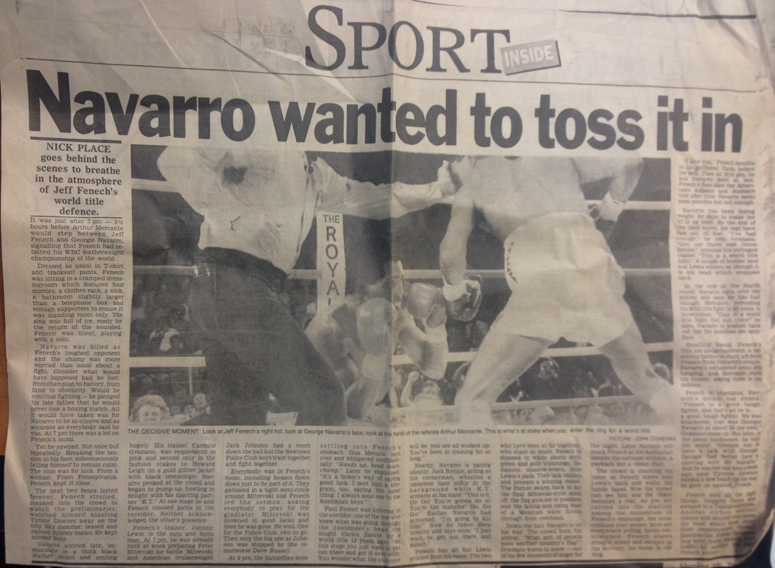 I got on well with Jeff Fenech and his entourage and was lucky enough to be writing during the last golden days of Australian boxing, when Fenech was a genuine champion of the world before the alphabet soup of myriad belts confused things. Fenech and Johnny Lewis were fantastic in allowing me to write this fight from a fly-on-the-wall perspective in the rooms before and after the fight. It required a lot of trust on their part. It also resulted in an unusual piece because I actually got to devote most of the words to everything but the world title fight itself.
