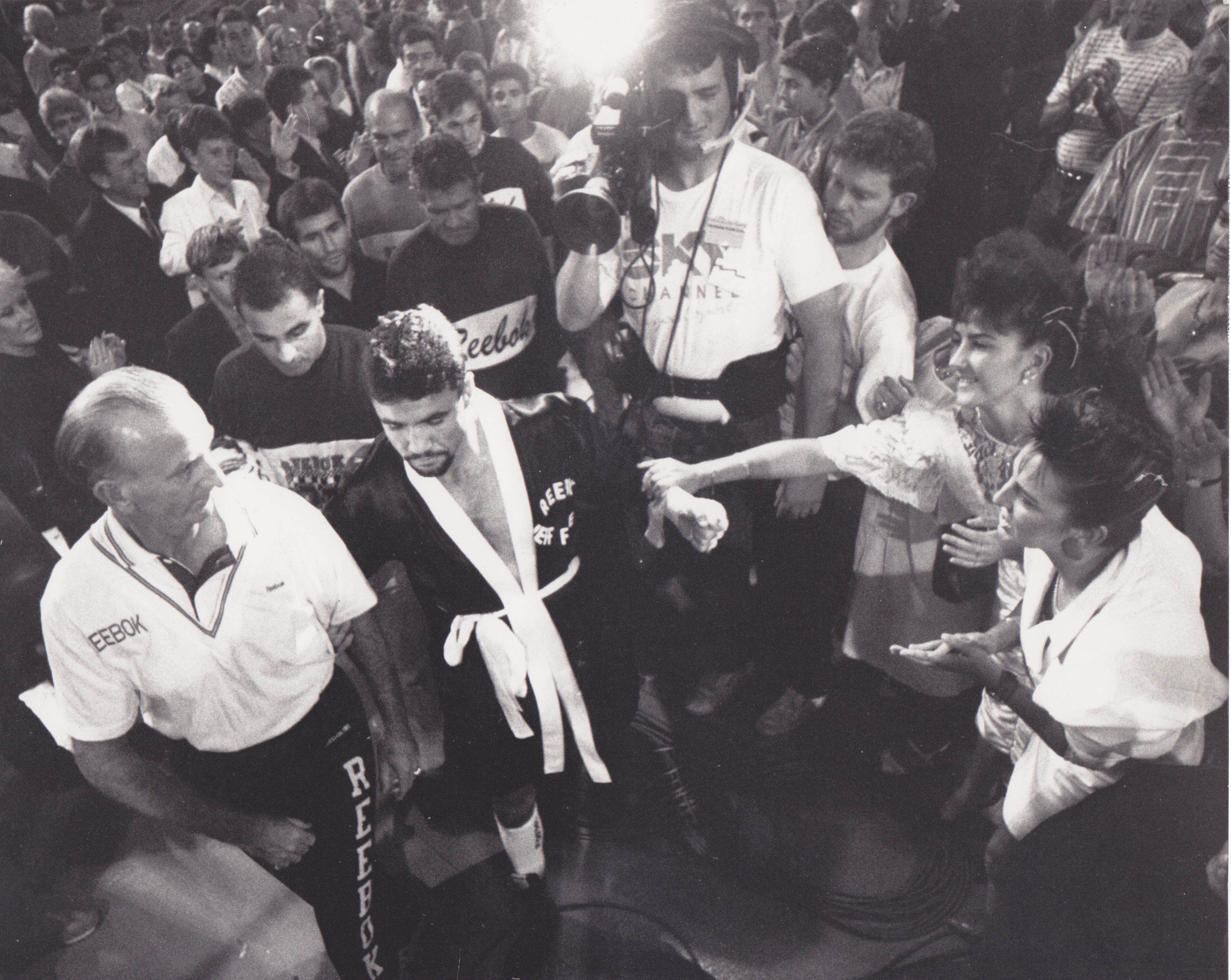 The crowd is chanting his name as Fenech stares into Lewis’s back and waits, his hands taped. Now the crowd can see him and the chant becomes a roar. As you are carried into the stadium among the momentum of Fenech’s entourage, the noise confuses your senses, faces are everywhere yelling, hands outstretched. Fenech stares straight ahead and escapes to his territory, his home in the ring.